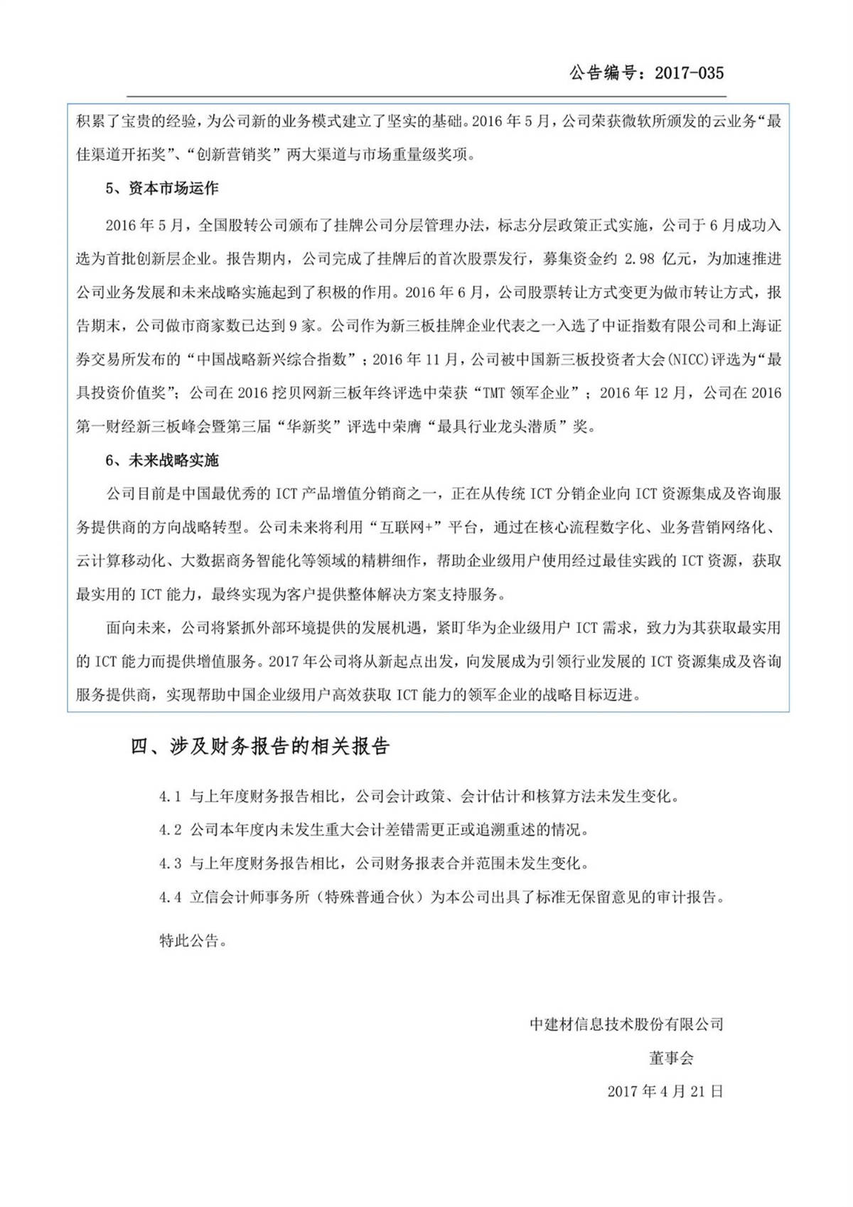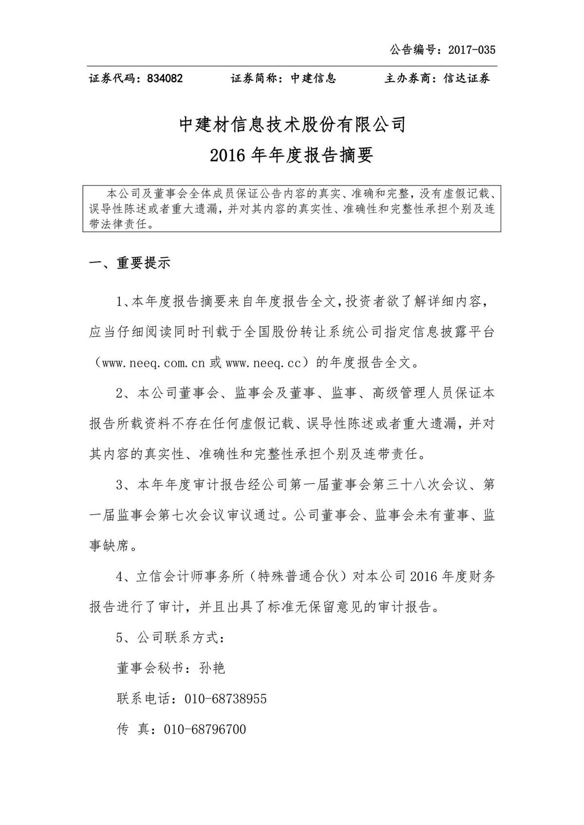 中建信息2016年年度报告摘要