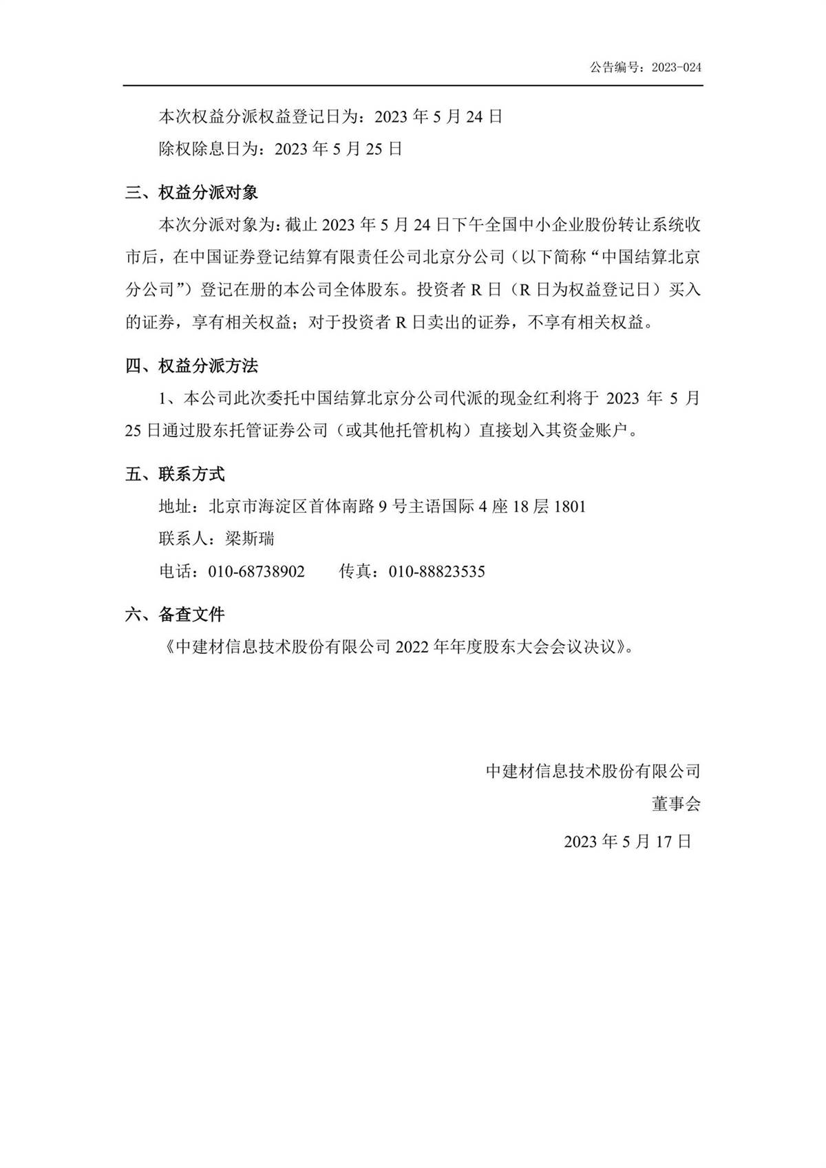 中建信息2022年年度权益分派实施公告