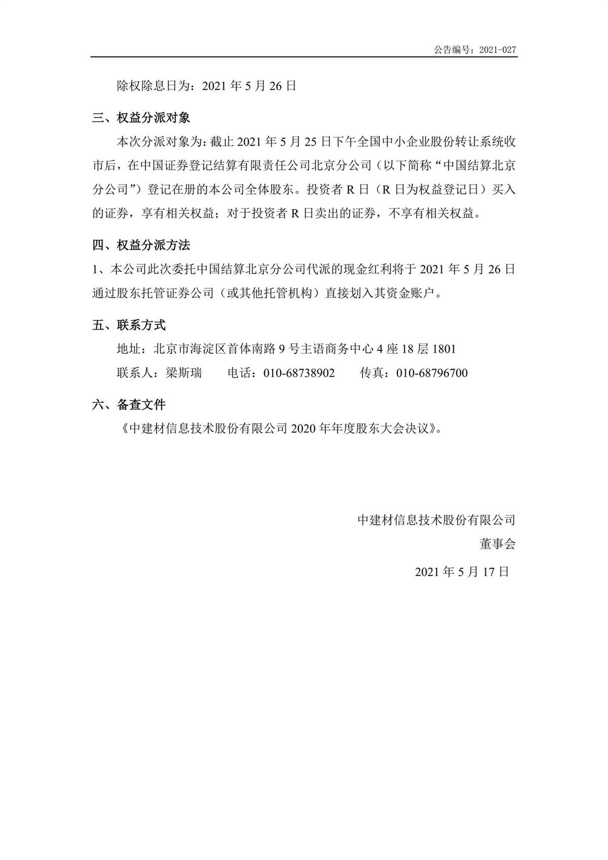 中建信息2020年年度权益分派实施公告