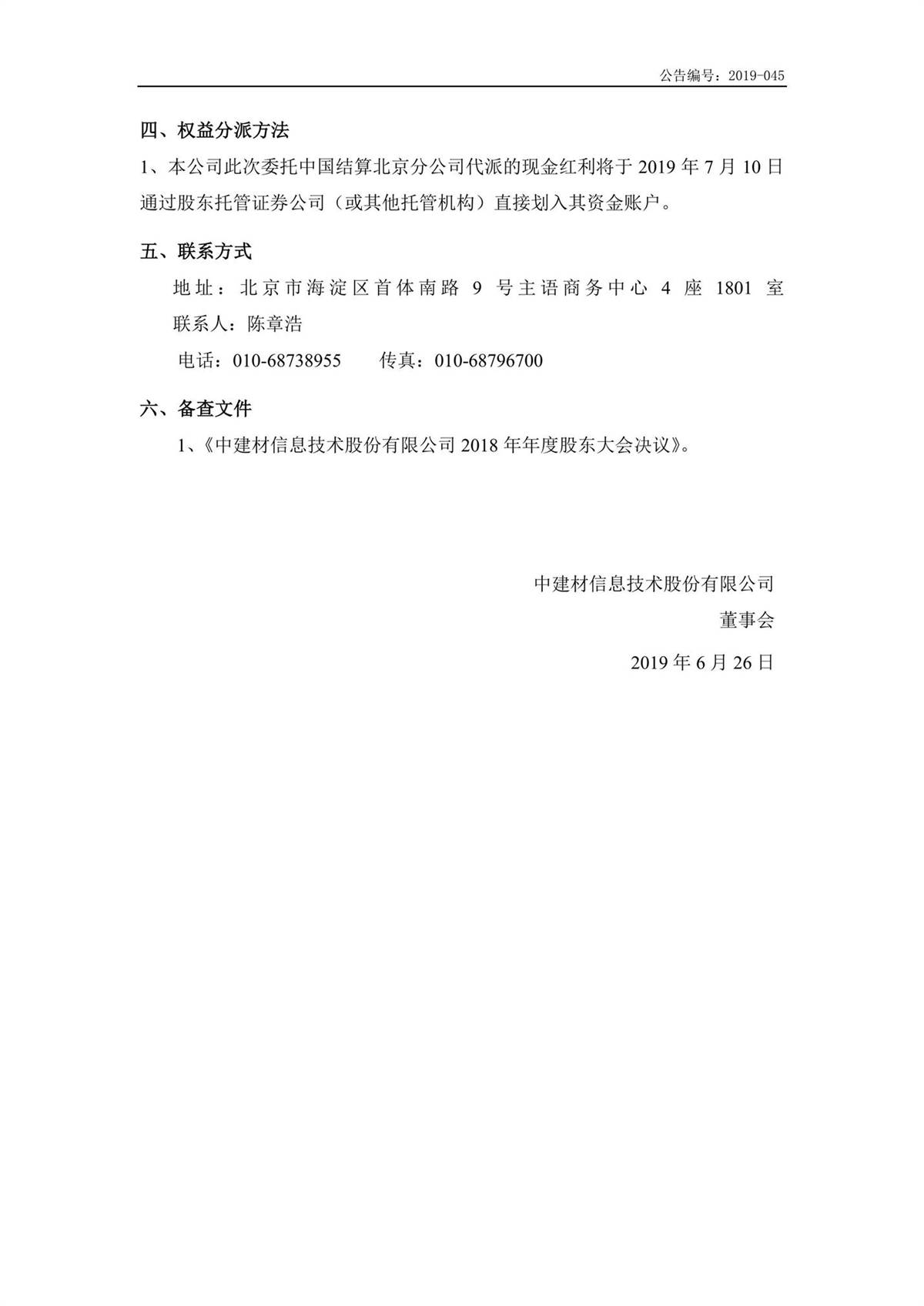 中建信息2018年年度权益分派实施公告