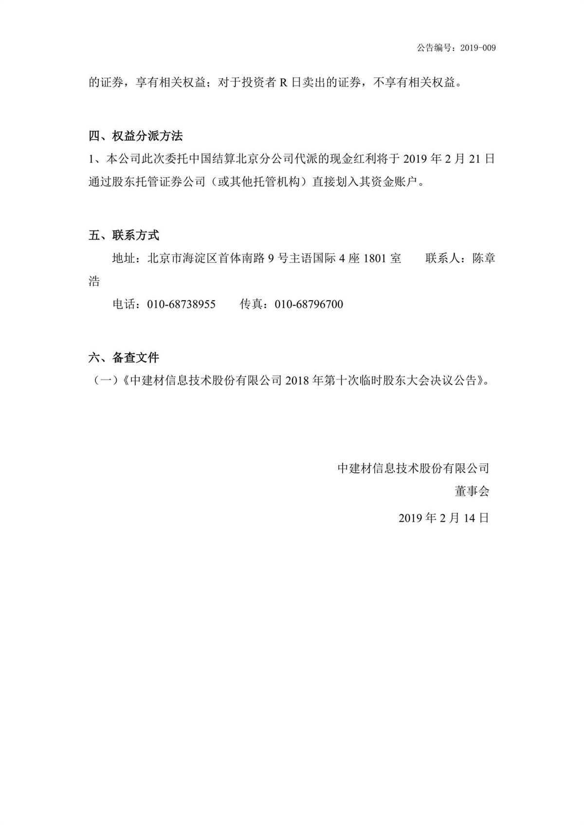 中建信息2018年第三季度权益分派实施公告