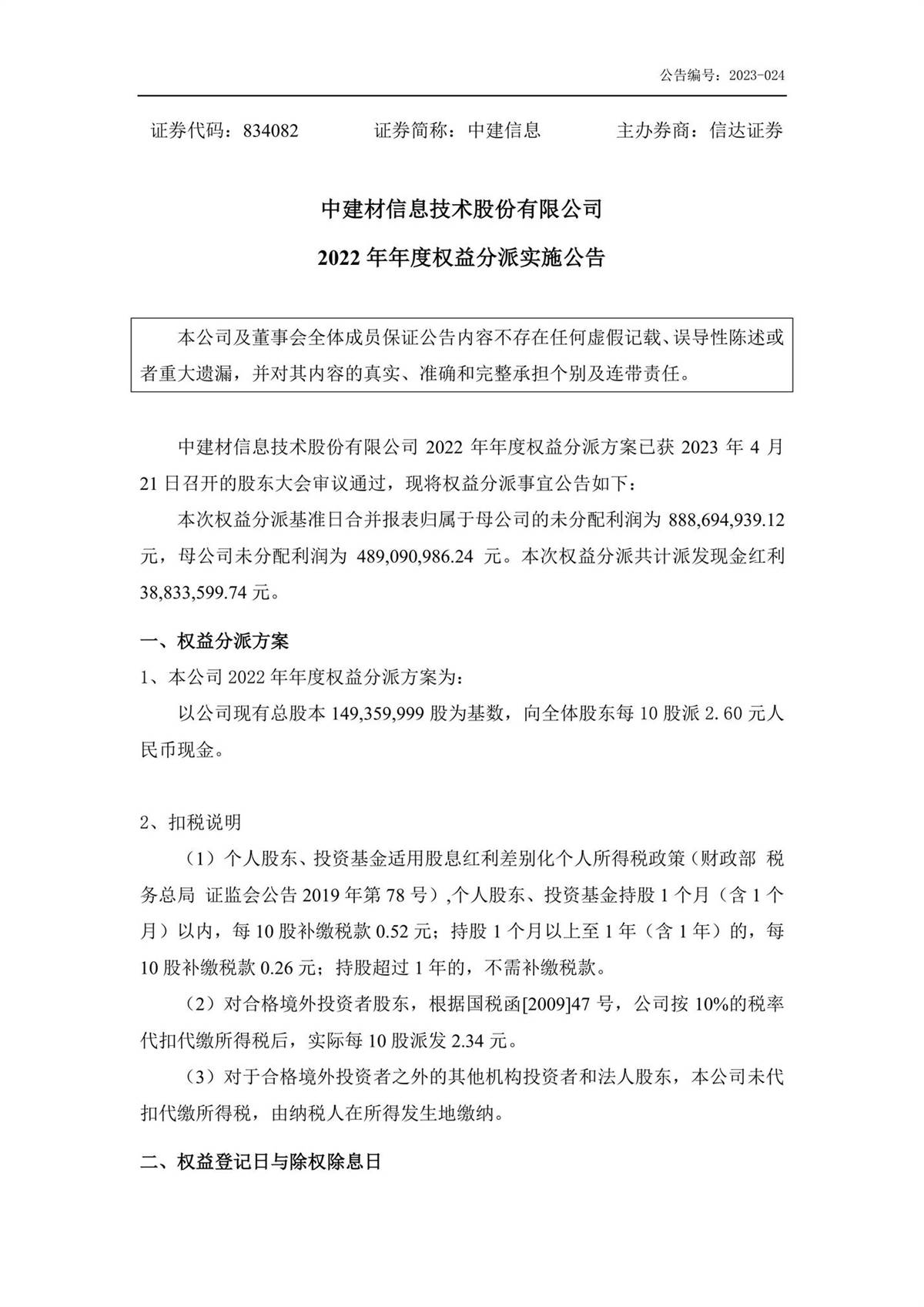 中建信息2022年年度权益分派实施公告