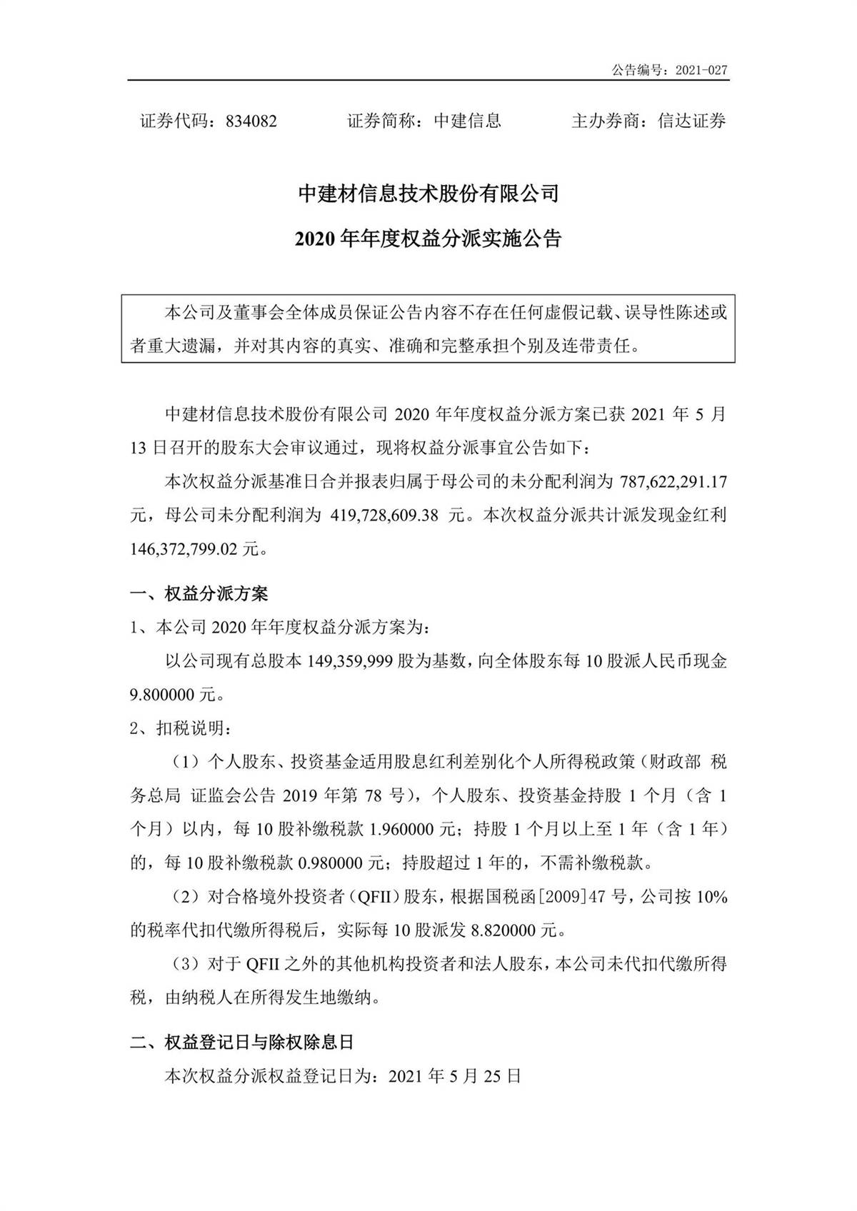 中建信息2020年年度权益分派实施公告